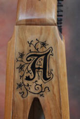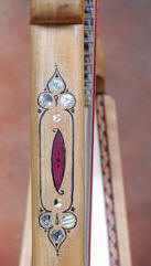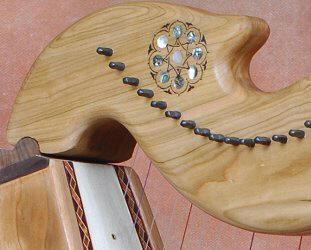 madreperla e legno di violetto, decori in china. 33 corde, a richiesta equipaggiabile con leve d'intonazione Estensione: DO1 - SOL5 Misure cm. 139 x 70, peso 9 kg. Celtic harp - Cherry body, aircrafted birch soundboard. Purpleheart wood and motherpearl inlays. china-ink paintings, 33 nylon strings from C1-G5 Sharping levers on demand Measures: cm. 139 x 70, weight: kg. 9